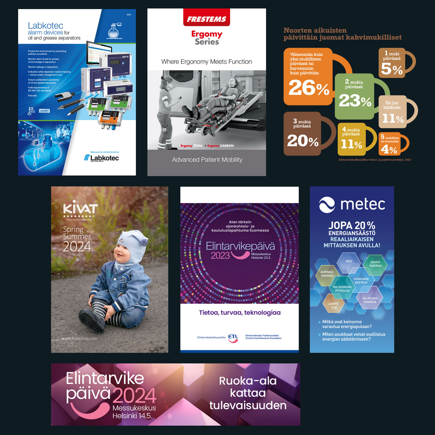 Luovasti suunnitellut ja näyttävästi toteutetut esitteet, ilmoitukset, lehtitaitot ja myynnin tukimateriaali ovat perinteistä mainontaa, josta meillä on pitkä kokemus.
